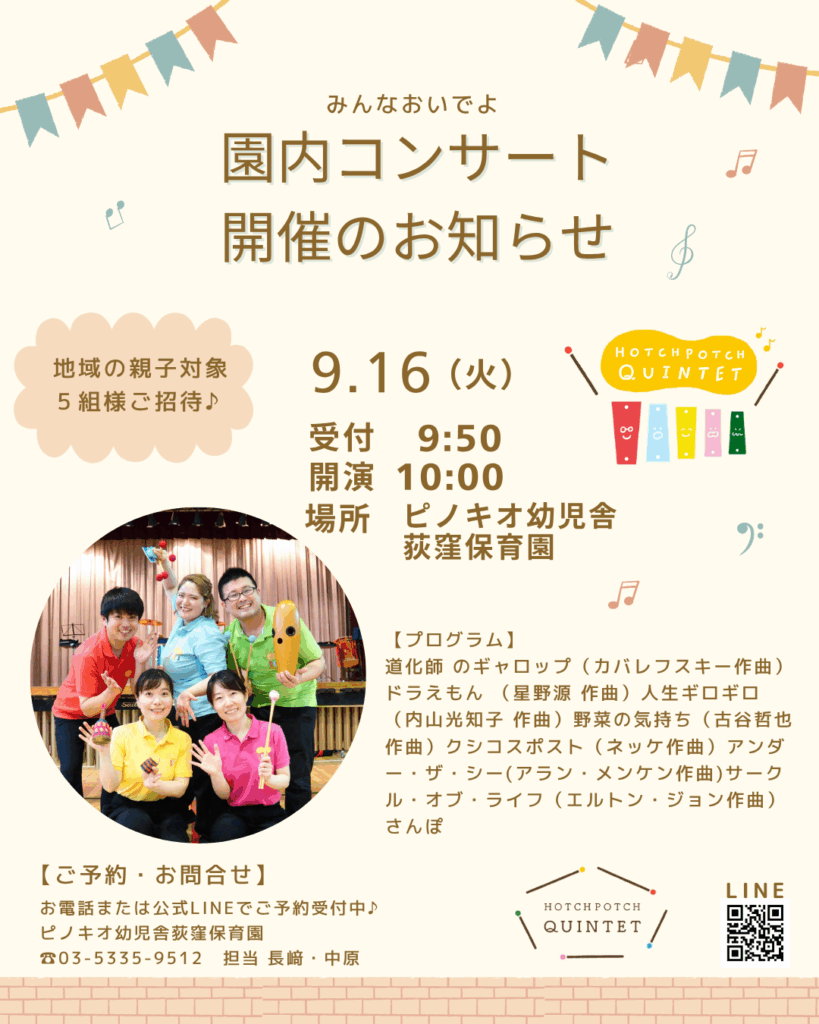 9月16日(火)10:00~ハッチポッチクインテットの皆様をお招きして園内コンサートを行います!
