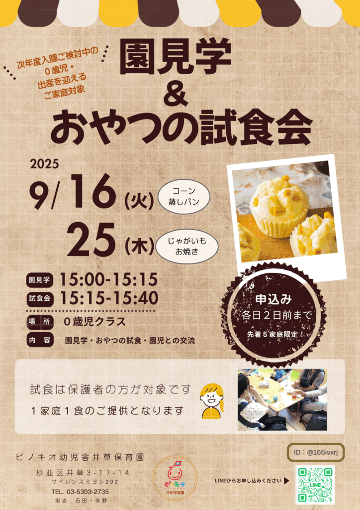 井草保育園 2025.09.01 おやつ試食会のご案内(9月)#井草保育園 園見学地域交流 園見学とおやつの試食会を開催します詳細は上記の通りとなります LINEでお申し込みください。*LINE友達追加→こちらから おやつの試食会ダウンロード