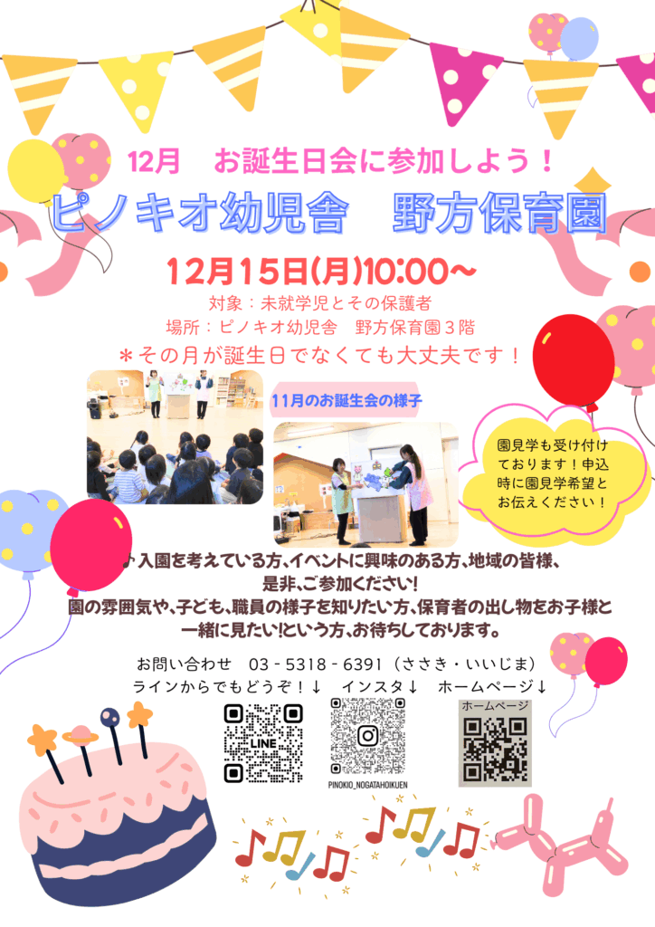 野方保育園 2025.12.03 12月 お誕生日会に参加しよう! 地域交流行事・イベント Lineはこちら 行事参加・園見学の予約を受け付けております。お電話での予約も可能です。 Instagramはこちら