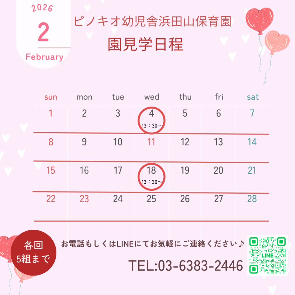 浜田山保育園 2026.01.05 【1月・2月】園見学のご案内 園見学 1月・2月の園見学のご案内です。 各回【5組】までのご案内となります。 お申込みや日時のご相談等はLINEかお電話にてお気軽にご連絡ください。 LINE友だち追加はこちらからどうぞ!