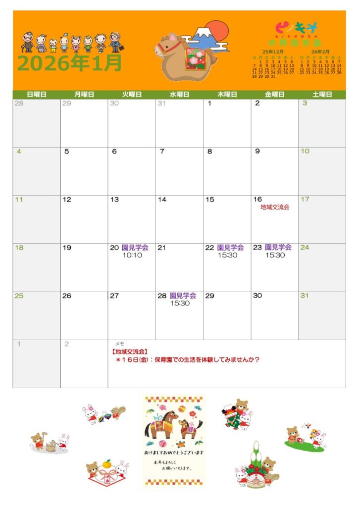 中野保育園 2026.01.05 1月 園見学・地域交流会のお知らせ 保育活動園見学地域交流子育て支援行事・イベント お申込み・お問い合わせは公式ラインにてお願いいたします。 ※受付が終了している日程・時間帯もありますのでご了承下さい。 担当:坂崎・下坂