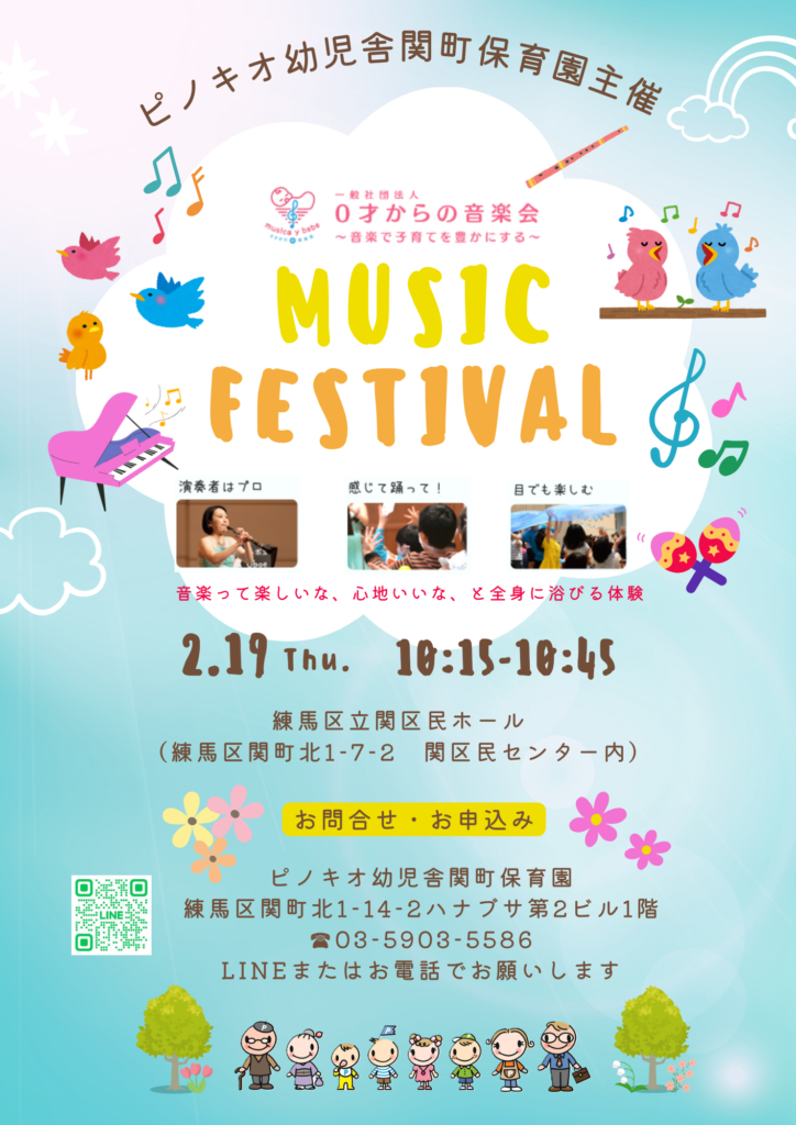 関町保育園 2026.01.20 2/19(木)関区民ホールにてミュージックフェスタ開催決定! #関町保育園 行事・イベント 赤ちゃんと一緒に音楽に触れる楽しい時間を過ごしませんか ご家族・お友達をお誘いあわせの上、お申込みください(当日参観は出来ません)