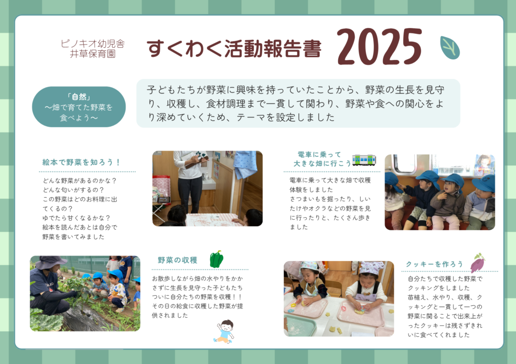井草保育園 2026.03.26 とうきょうすくわくプログラム活動報告 #井草保育園 とうきょうすくわくプログラム 2025年度 1,2歳児クラスがとうきょうすくわくプログラム推進事業に参加しましたテーマは「自然~畑で育てた野菜を食べよう~」自分たちで野菜を育て、収穫し、調理をした野菜をおいしく食べることが出来ました!! すくわく活動報告書ダウンロード