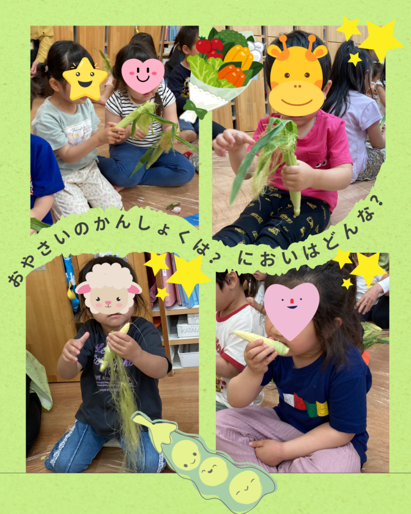 農家さんのお野菜を収穫し触ったり、においをかいでみたりしました。